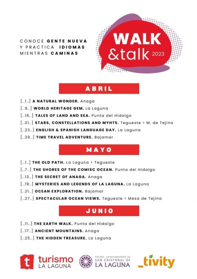 ‘Walk and Talk’ se compone de 15 actividades que tienen como objetivo principal impulsar un espacio de convivencia entre personas de diferentes orígenes y lenguas, fomentando las relaciones personales y la creación de nuevas redes colaborativas. El programa se sustenta en el carácter cosmopolita y multicultural de La Laguna, convertida en un punto de encuentro que crea nuevos lazos de diálogo y cooperación entre la población local y extranjeros residentes.